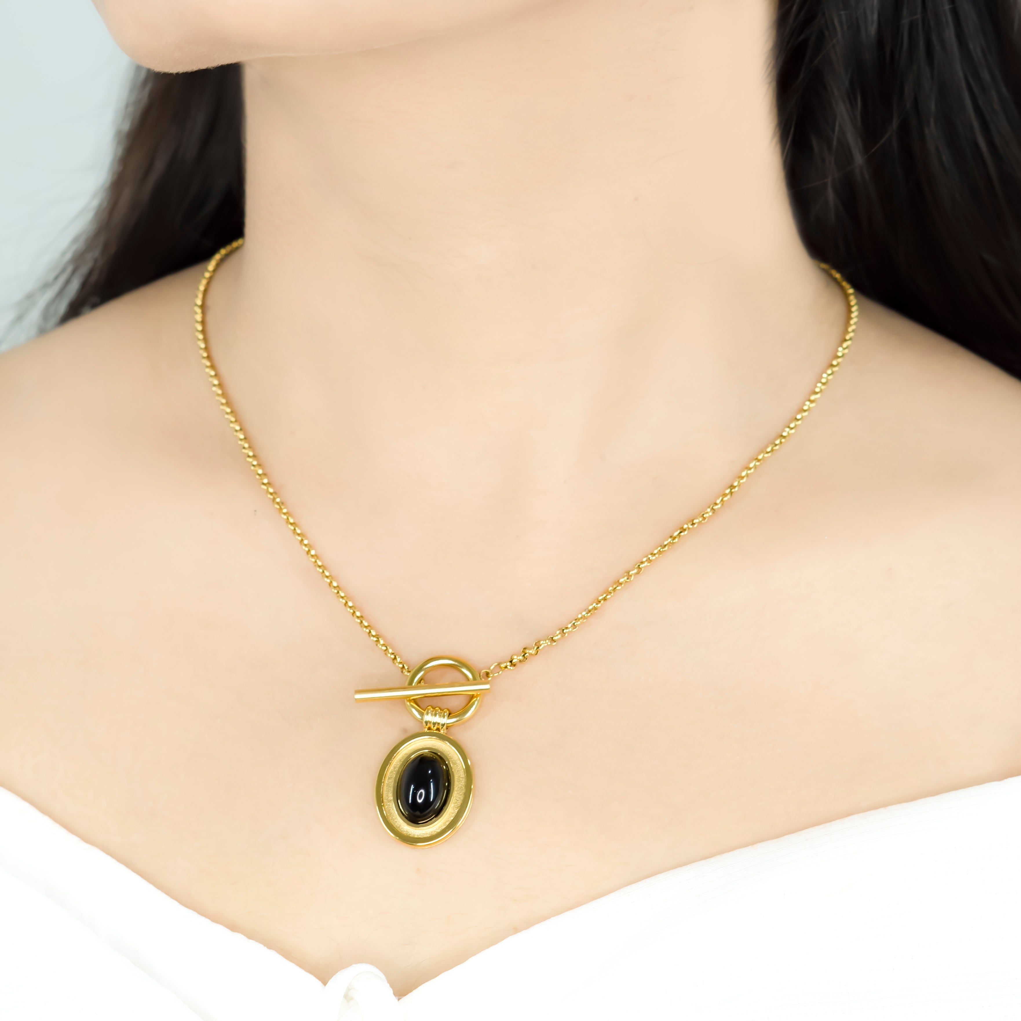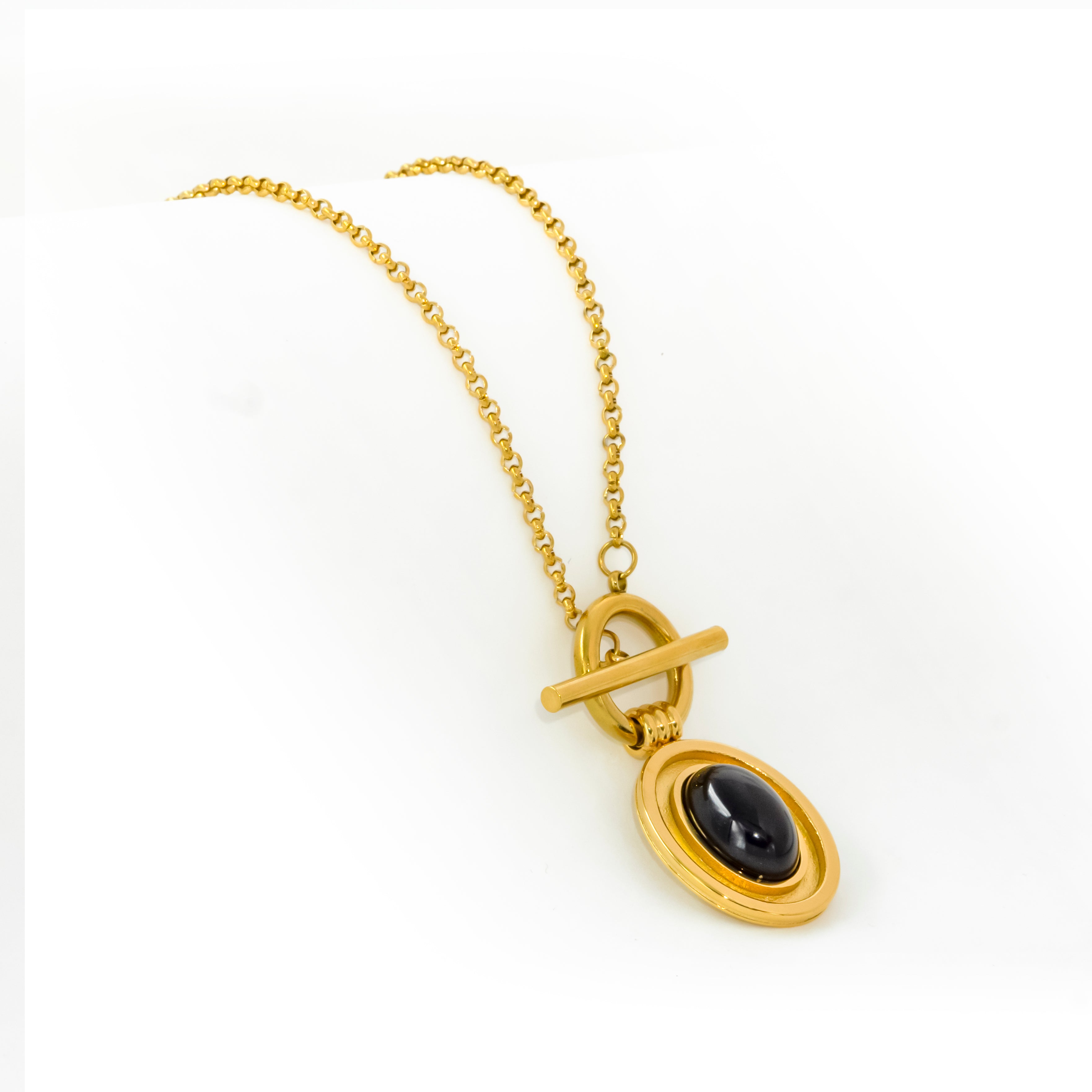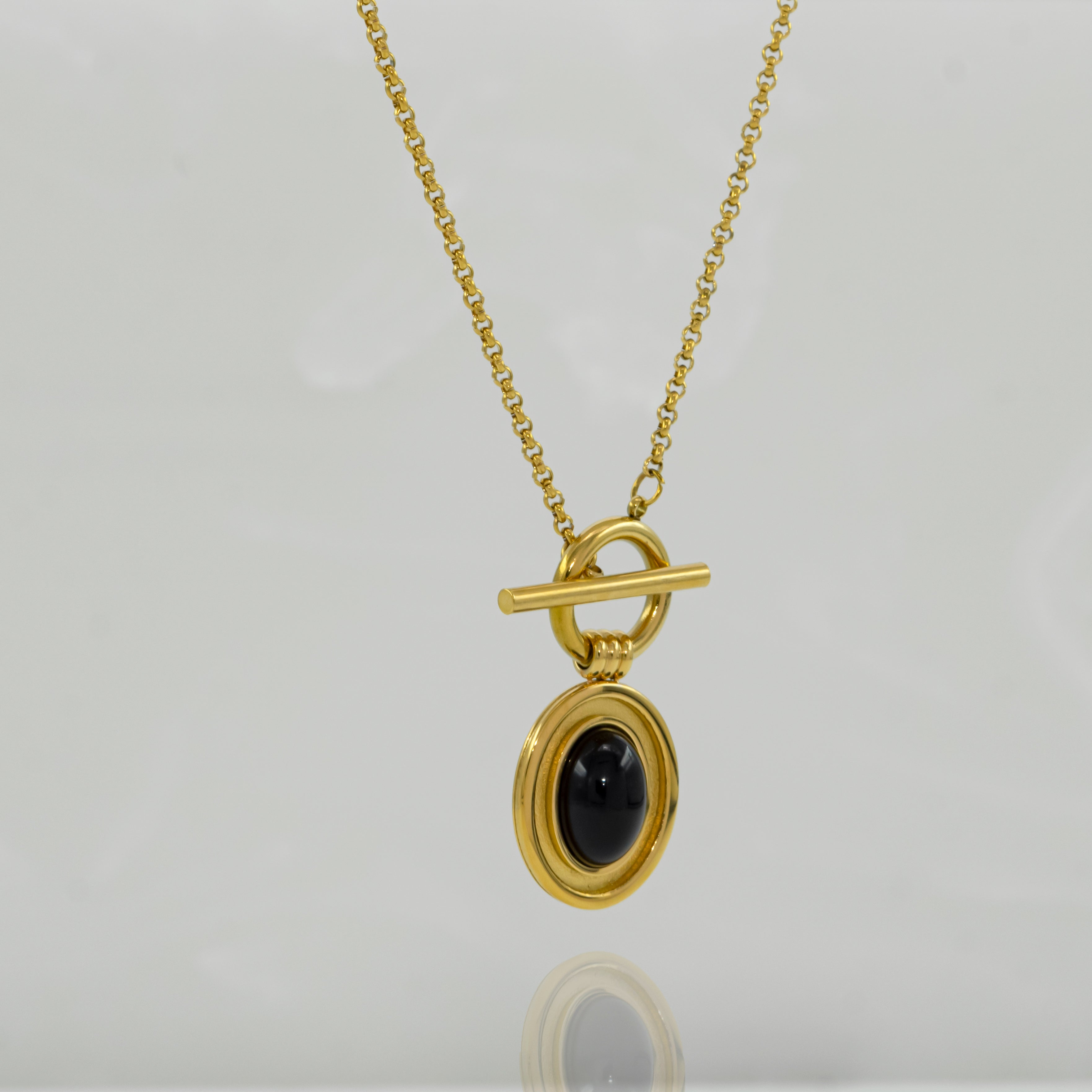 Style and sass begings where a sleek golden chain meets a classic OT buckle and a perfect dangling black stone.
